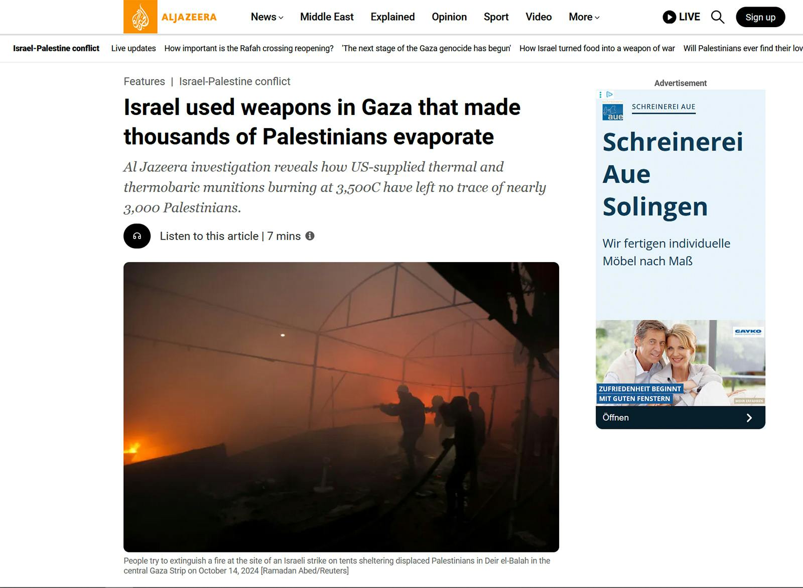 „Eine Ermittlung von Al Jazeera enthüllt, wie von den USA gelieferte thermische und thermobarische Munition, die bei 3.500 °C brennt, von fast 3.000 Palästinensern keine Spuren hinterlassen hat.“