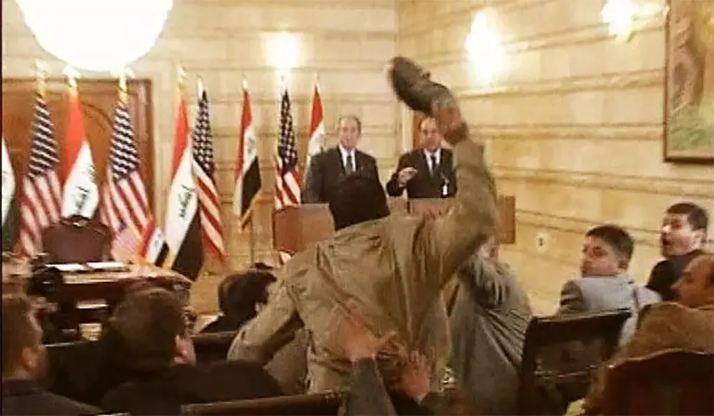Foto: Der irakische Journalist Muntazer al-Zaidi wirft bei einer Pressekonferenz in Bagdad 2008 einen Schuh nach George W. Bush. Jeder in der Region hat das als Ausdruck höchster Respektlosigkeit verstanden, im Westen eher so: „Häh?“
