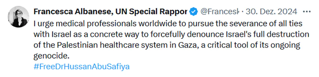 „Ich fordere medizinische Fachkräfte auf der ganzen Welt auf, den Abbruch aller Beziehungen zu Israel als konkreten Weg anzustreben, um die vollständige Zerstörung des palästinensischen Gesundheitssystems in Gaza durch Israel, ein entscheidendes Instrument seines anhaltenden Völkermords, energisch anzuprangern.“